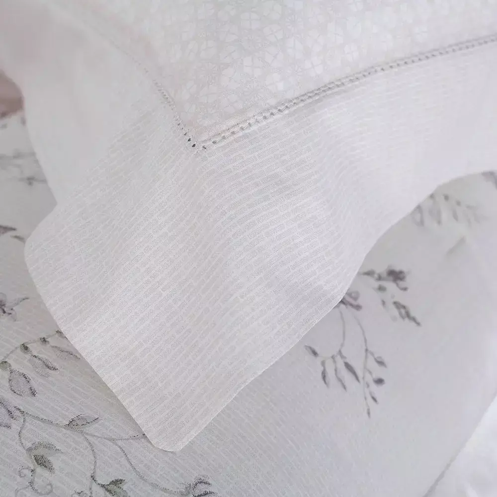 Delicadas flores acuareladas con matices coloridos sobre una base neutra, iluminan la habitación, aportando frescura y suavidad con la terminación exclusiva del punto ajour.
